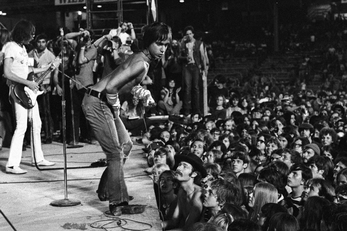 CINCINNATI - JUNE 23: Iggy Pop and guitarist Ron Asheton of the Stooges perform live at Crosley Field on June 23, 1970 in Cincinnati, Ohio. (Photo by Tom Copi/Michael Ochs Archive/Getty Images)[/caption]